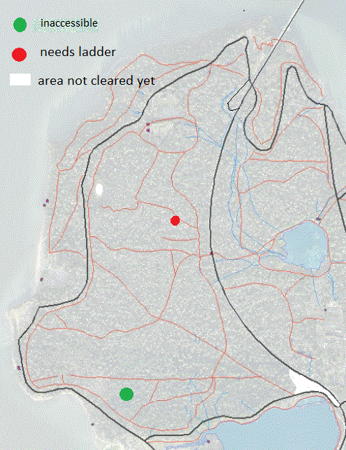 The Green dot on the map is a large area just north of the north east corner of the blowdown area. I found it in 2014 just after switching priorities from Ivy to Blackberries, so it was low priority. But now access is completely blocked with regrowth. I don't see that changing for a decade.