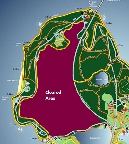English Ivy is the most wide spread invasive plant in Stanley Park. When allowed into our wilds, it chokes out the native understory creating a mono-culture. Its ground cover displaces all annual greenery and prevents replacement trees from sprouting. It propagates primarily by being physically transported by vehicles, bikes, walkers, and importantly, by workers' equipment. Only a small piece of root or even a leave is sufficient to start a new plant. Once started, it can grow ten feet in diameter each year.