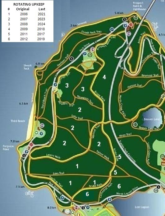 Most comments I receive from passers-by imply this is a "fool's errand" or impossible objective. No so. By myself, I have cleared all the red areas on west side of the map below. With help, we could completely finish the wild, west half of the park. The claims that clearing ivy "requires years of maintenance and replanting with native species" is garbage. Native plants spring up within months, and careful, complete pulling does a permanent job. A quick walk through to find the last remaining pieces a year later is the only follow-up needed.