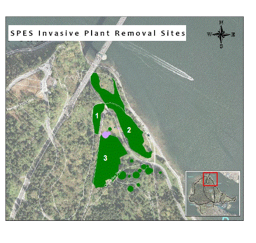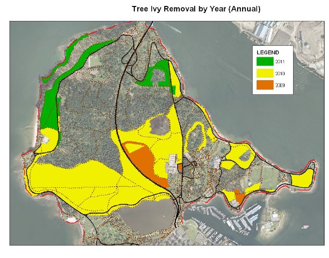 In the 2012 Invasive Plant Mapping Update document SPES published maps of their successful 'removals'. One of their maps is below from page 32. But they have not cleared ANY defensible area of ivy.